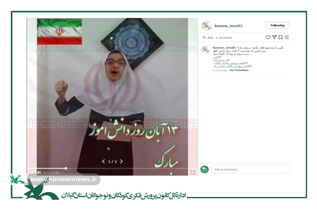 برپایی ایستگاه فعالیتهای فرهنگی، هنری و ادبی در پیادهراه فرهنگی شهر رشت، معرفی شخصیت، رویدادها و همچنین، برگزاری کارگاه ادبی(نوشتههای کودکان و نوجوانان)، آموزش کاردستی با بهرهگیری از شیوه کاغذوتا، اجرای فعالیت نقاشی با محوریت رخدادهای ۱۳ آبان و اهدای کتاب به کودکان و نوجوانان، بههمینمنظور صورتگرفت و با حضور کارکنان و اعضا در تجمع مردمی همراهشد.