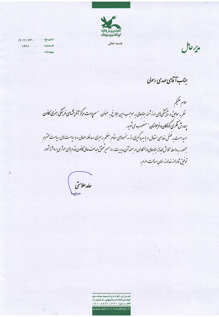 به گزارش اداره کل روابط عمومی و امور بینالملل کانون، حامد علامتی در این حکم به شایستگیها و تجربههای ارزشمند مهدی رسولی اشاره کرده و مسئولیت مرکز آفرینشهای فرهنگی هنری کانون را به وی سپرده است.