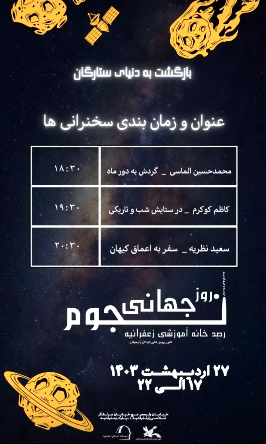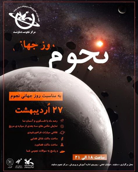 به گزارش روابط عمومی اداره کل کانون استان تهران، بزرگداشت هفته جهانی نجوم در روزهای پنج شنبه و جمعه ۲۷ و ۲۸ اردیبهشت ماه در چهار نقطه از تهران، برگزار شد.