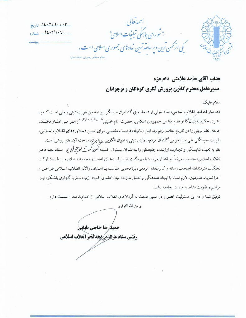 رییس ستاد مرکزی کمیته دهه فجر انقلاب اسلامی در پایان این حکمِ مدیرعامل کانون نوشته است: لازم است با ایجاد هماهنگی و تعامل سازنده میان اعضای کمیته، زمینهساز برگزاری باشکوه این مراسم و تقویت نشاط و امید در جامعه باشید. توفیق شما را در این مسئولیت خطیر و در مسیر خدمت به آرمانهای انقلاب اسلامی از خداوند متعال مسئلت دارم.
