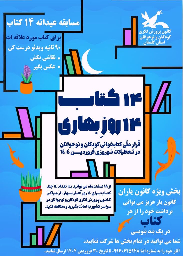 به گزارش روابط عمومی ادارهکل کانون پرورش فکری کودکان و نوجوانان استان گلستان، بر اساس این طرح، اعضای مراکز فرهنگی هنری کانون میتوانند از روز ۱۸ اسفند ۱۴۰۳، ۱۴ جلد کتاب از کتابخانههای کانون امانت میگیرند تا در روزهای تعطیلات نوروزی از مطالعه آنها در کنار خانواده و طبیعت لذت ببرند.