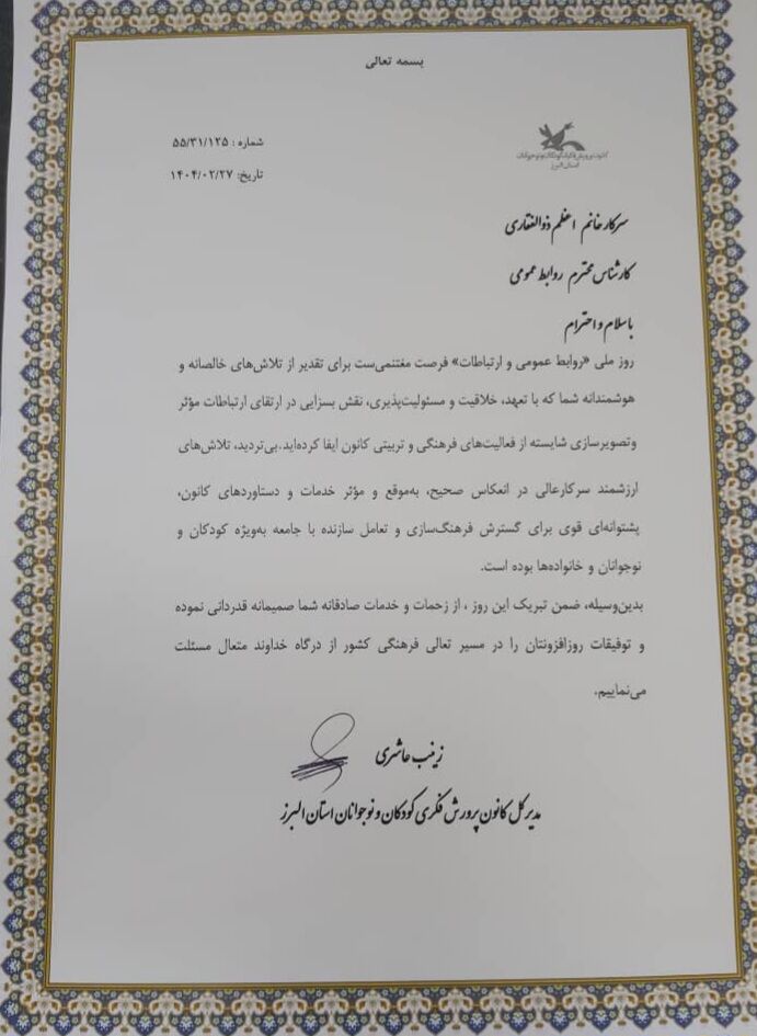 مدیر محترم روابط عمومی کانون پرورش فکری کودکان و نوجوانان استان البرز