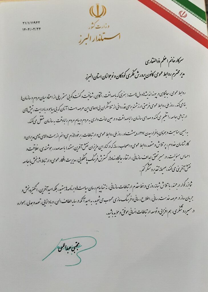 روز ملی «روابط عمومی» و «ارتباطات» فرصت مغتنمی است برای تقدیر از تلاش‌های خالصانه و هوشمندانه شما که با تعهد، خلاقیت و مسئولیت‌پذیری، نقش بسزایی در ارتقای ارتباطات مؤثر و تصویرسازی شایسته از فعالیت‌های فرهنگی و تربیتی کانون ایفا کرده‌اید. بی‌ تردید، تلاش‌های ارزشمند سرکارعالی در انعکاس صحیح، به‌ موقع و مؤثر خدمات و دستاوردهای کانون، پشتوانه‌ای قوی برای گسترش فرهنگ‌سازی و تعامل سازنده با جامعه به‌ ویژه کودکان و نوجوانان و خانواده‌ها بوده است.