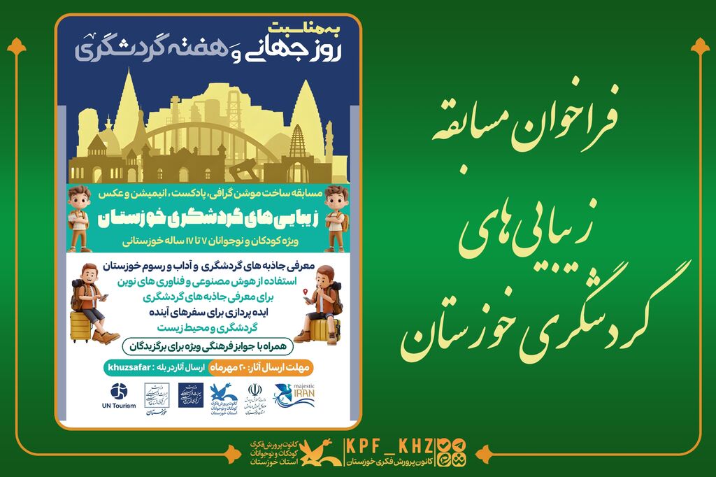 به گزارش روابطعمومی ادارهکل کانون پرورش فکری کودکان و نوجوانان خوزستان، همزمان با هفته گردشگری، فراخوان ساخت آثار فرهنگی هنری با عنوان «زیباییهای گردشگری خوزستان» به همت کانون پرورش فکری کودکان و نوجوانان و با همکاری ادارهکل میراث فرهنگی، گردشگری و صنایعدستی استان منتشر شد.