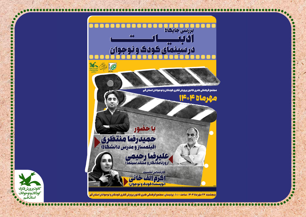 نشست تخصصی «بررسی جایگاه ادبیات در سینمای کودک و نوجوان» روز پنج‌شنبه ۲۴ مهرماه ۱۴۰۴ در مجتمع فرهنگی‌هنری کانون پرورش فکری کودکان و نوجوانان استان قم برگزار شد. این برنامه هم‌زمان با هفته ملی کودک و با حضور علیرضا خضری‌فرد، مدیرکل کانون پرورش فکری استان قم، سید حمیدرضا منتظری، مدرس سینما و مدیر انجمن سینمای جوانان قم، علیرضا رحیمی، فیلمساز و منتقد و اکرم الف‌خانی، نویسنده کودک و نوجوان، مربیان و اعضای فعال مراکز به این حوزه برگزار شد و همچنین در این نشست فیلم‌های «نان و کوچه» و «همسرایان» از آثار عباس کیارستمی مورد تحلیل و بررسی قرار گرفت.