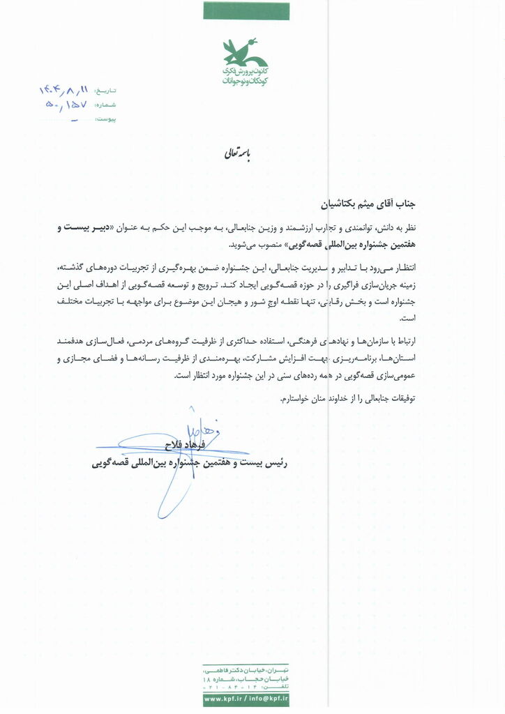 به گزارش اداره کل روابط عمومی و امور بینالملل کانون، فرهاد فلاح رییس جشنواره قصهگویی و معاون فرهنگی کانون پرورش فکری در این حکم به سوابق اجرایی و تجربههای فرهنگی میثم بکتاشیان اشاره و این مسئولیت را به او سپرده است.