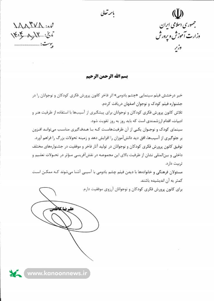 علیرضا کاظمی، وزیر آموزش و پرورش، در پیامی به کانون پرورش فکری کودکان و نوجوانان، از موفقیت فیلم سینمایی «چشم بادومی» در جشنواره بین‌المللی فیلم‌های کودکان و نوجوانان اصفهان قدردانی کرد.