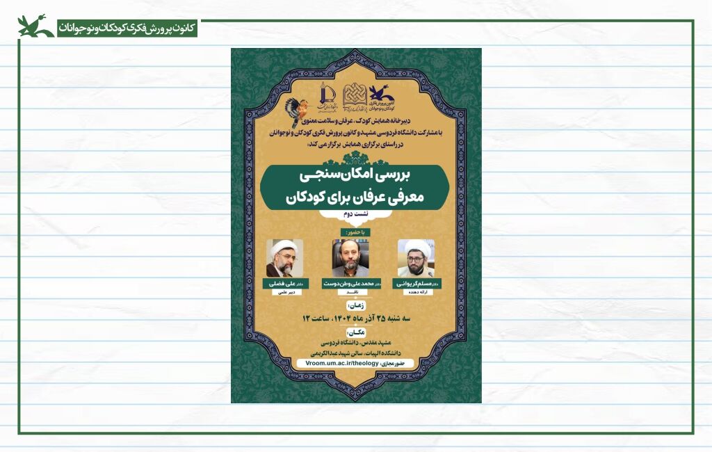 اداره کل آموزش و پژوهش کانون پرورش فکری کودکان و نوجوانان نشست «بررسی امکان سنجی معرفی عرفان برای کودکان» را با مشارکت دبیرخانه همایش ملی کودک، عرفان و سـلامت معنوی و دانشـگاه فردوسی مشهد به صورت برخط برگزار می‌کند.