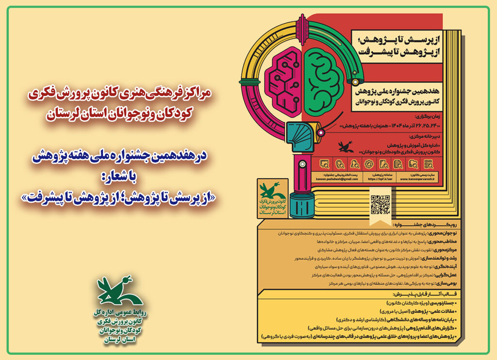بهگزارش روابطعمومی ادارهکل کانون پرورش فکری کودکان و نوجوانان استان لرستان، همزمان با گرامیداشت هفته پژوهش، مجموعهای از ویژهبرنامهها از تاریخ ۲۲ تا ۳۰ آذرماه ۱۴۰۴ در تمامی مراکز فرهنگیهنری کانون استان در حال برگزاری است.