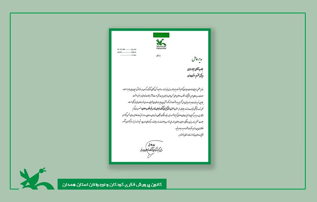 نظر به تعهد، شایستگی و تجارب ارزنده، جنابعالی را به عنوان«مسئول استانی کمیتهی کودک و نوجوان ستاد دهه فجر انقلاب اسلامی» منصوب میکنم.