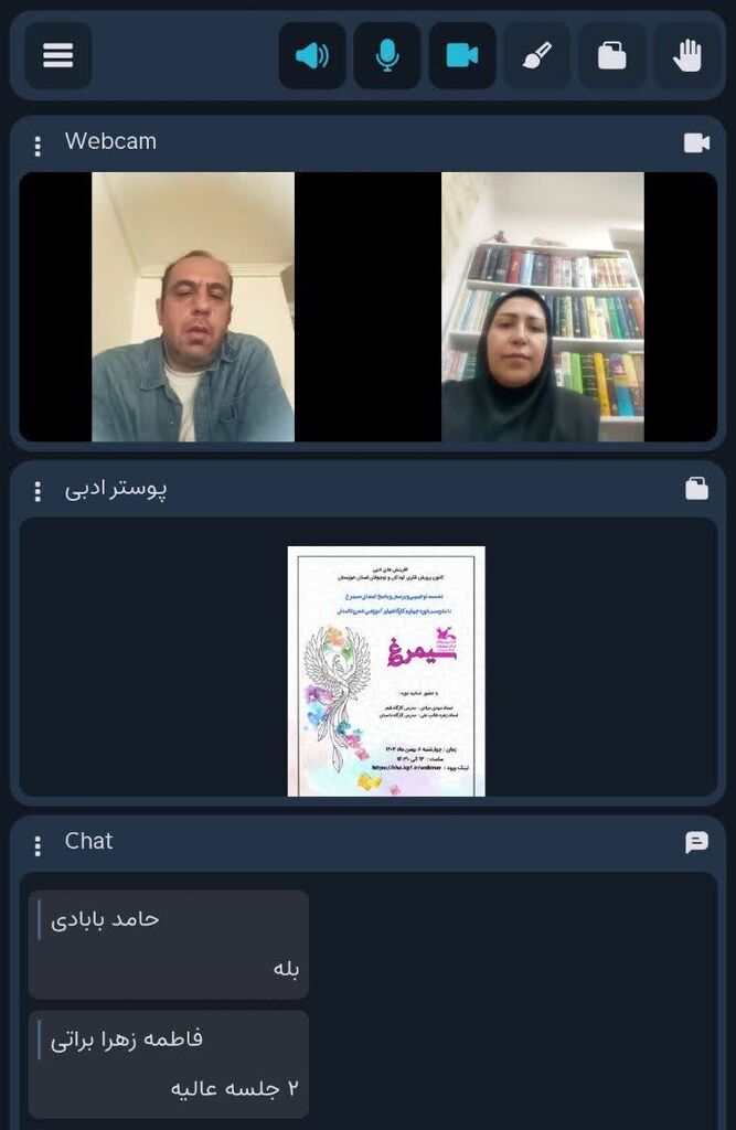 به گزارش روابط‌عمومی اداره‌کل کانون پرورش فکری خوزستان، نشست توجیهی اعضای «سیمرغ» هم‌زمان با آغاز چهارمین دوره کارگاه‌های شعر و داستان، روز چهارشنبه هشتم بهمن‌ماه به‌صورت مجازی برگزار شد. این نشست با حضور اعضای نوجوان باشگاه ادبی سیمرغ و اساتید دوره، با هدف آشنایی، تبیین روند آموزشی و پاسخ‌گویی به پرسش‌ها و ابهامات شرکت‌کنندگان شکل گرفت.