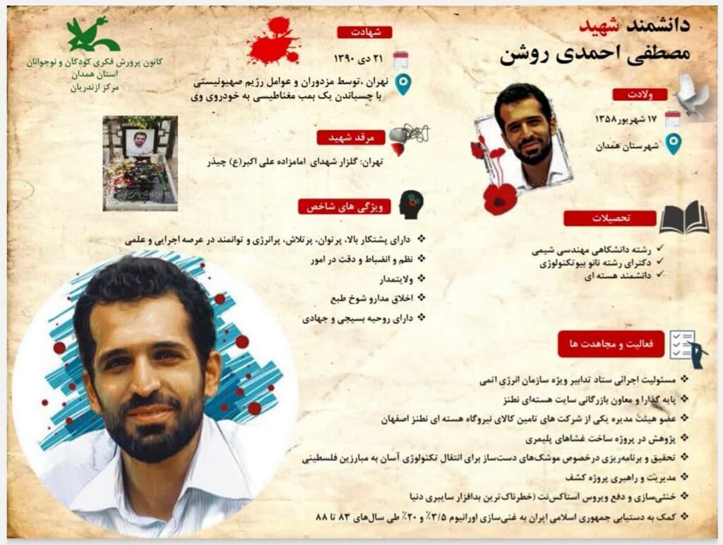 همچنین مربی مسوول مرکز فرهنگی- هنری  ازندریان در قالب اینفوگرافیک به معرفی شهید دانشمند هسته ای  مصطفی احمدی روشن که متولد همدان است،  پرداخته است.