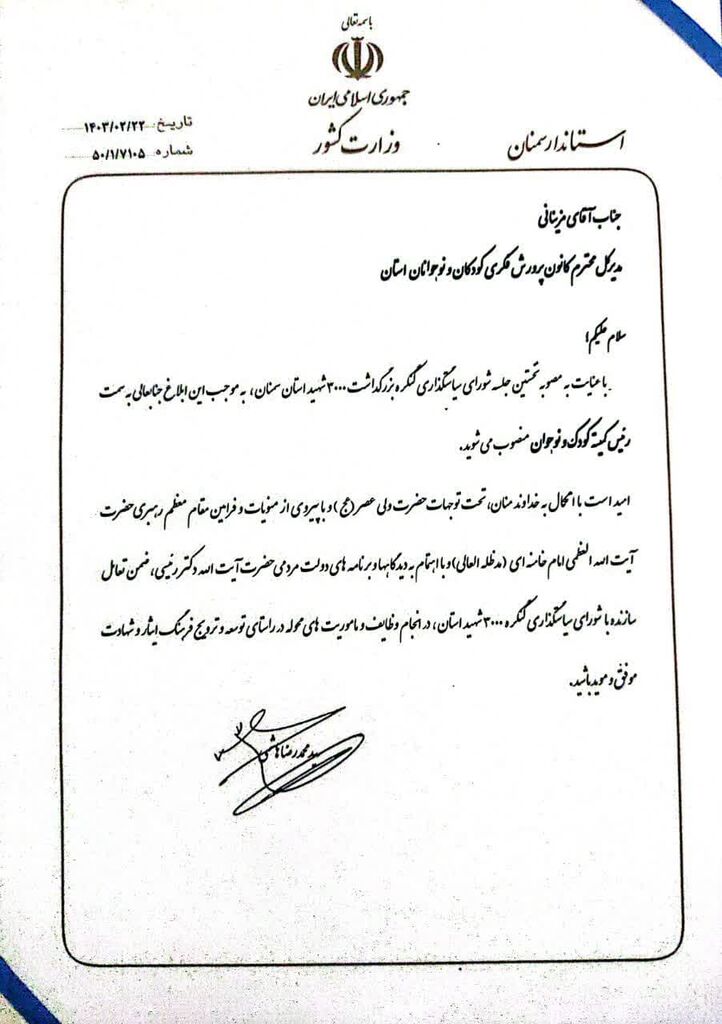 استاندار سمنان در حکم انتصاب رئیس کمیته کودک و نوجوان ستاد کنگره شهدای استان سمنان آورده است: با عنایت به مصوبه نخستین جلسه شورای سیاستگذاری کنگره بزرگداشت ۳۰۰۰ شهید استان سمنان، بهموجب این ابلاغ، جنابعالی به سمت رئیس کمیته کودک و نوجوان منصوب میشوید.