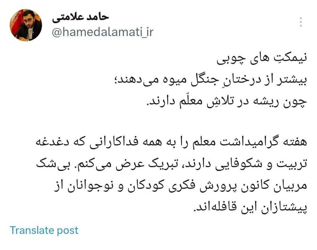به گزارش اداره کل روابط عمومی و امور بینالملل کانون، حامد علامتی در این پیام که روز ۱۳ اردیبهشت ۱۴۰۴ در صفحه شخصی او در شبکه اجتماعی اکس(توییتر) به این مناسبت منتشر شده، آورده است: نیمکتهای چوبی بیشتر از درختان جنگل میوه میدهند؛ چون ریشه در تلاش معلم دارند.