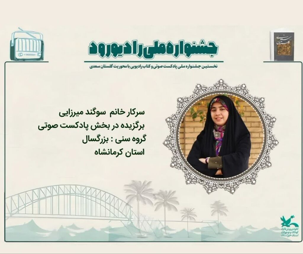 در همین راستا آرتین صابری عضو فعال مرکز فرهنگی هنری کانون پرورش فکری کودکان و نوجوانان کنگاور استان کرمانشاه، در جشنواره ملی رادیو رود (بخش نوجوان کتاب صوتی و با محوریت گلستانخوانی) از برگزیدگان اعلام شد، همچنین سوگند میرزایی عضو ارشد کانون استان (در بخش پادکست صوتی بزرگسال) بهعنوان برگزیده اول و با بالاترین امتیاز حائز رتبه در این جشنواره شد.