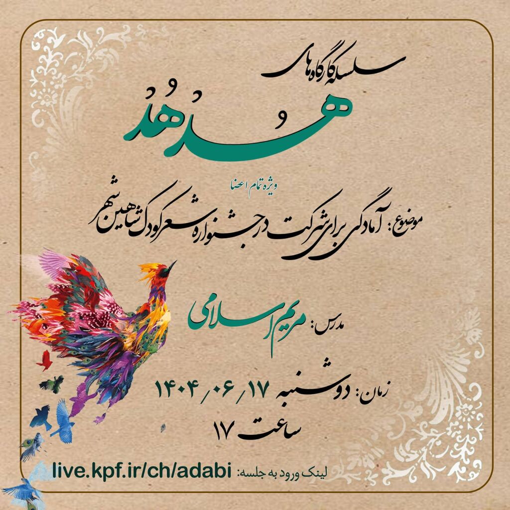 نخستین نشست از سلسله جلسههای این برنامه با حضور مریم اسلامی و با موضوع «شعر کودک» روز شنبه ۱۷ شهریور ۱۴۰۴ بهصورت سایبری و با مبحث آمادگی برای شرکت در جشنواره شعر کودک شاهینشهر برگزار شد.