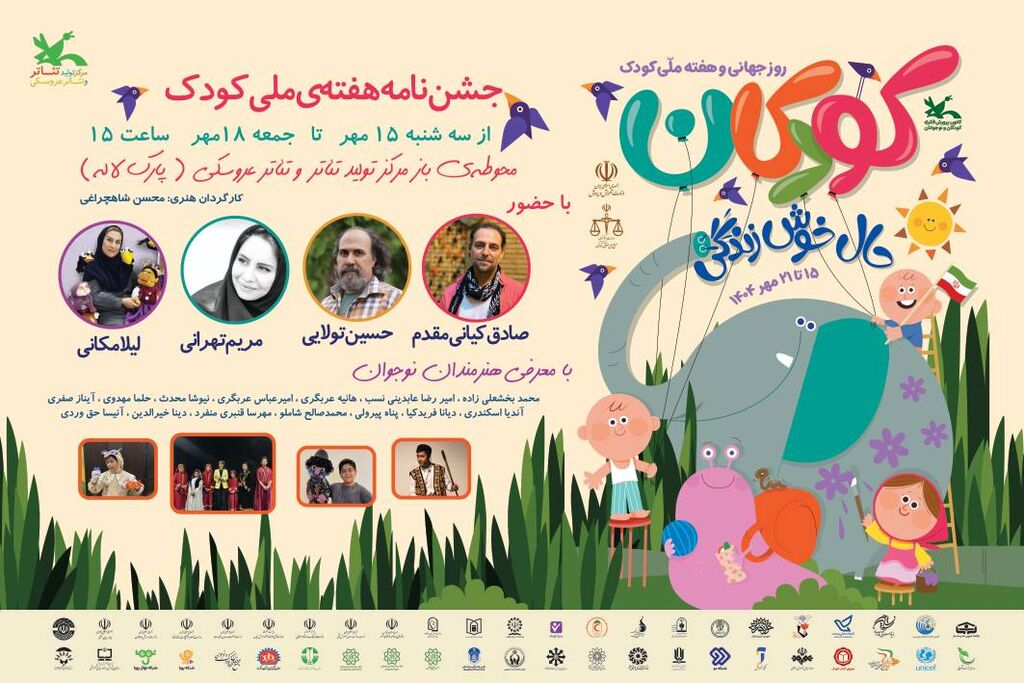 جشننامه هفته ملی کودک از ۱۵ تا ۱۸ مهر ساعت ۱۵ در محوطه باز مرکز تئاتر و تئأتر عروسکی کانون پرورش فکری کودکان و نوجوانان واقع در پارک لاله تهران برگزار میشود.