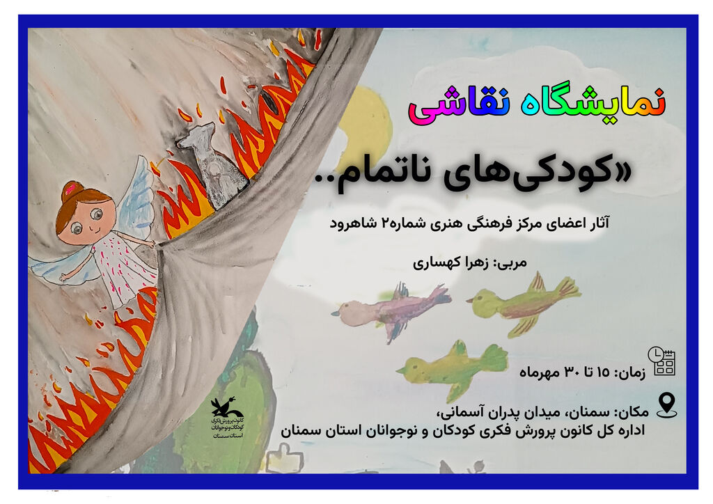 وی در پایان اظهار داشت: نمایشگاه «کودکیهای ناتمام» همزمان با هفته ملی کودک افتتاح شده و علاقهمندان میتوانانند جهت بازدید از این آثار تا پایان ماه جاری (مهرماه) به اداره کل کانون استان واقع در میدان پدران آسمانی مراجعه نمایند.