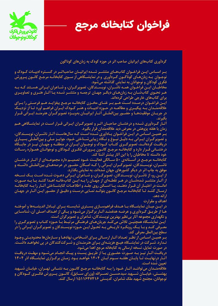 بر همین اساس در این فراخوان یادآوری شده است که سالهاست آثار نویسندگان، ناشران و تصویرگران ایرانی به دلیل نبوغ و نگاه زیباییشناختی خود، جوایز ملی و بینالمللی بسیاری دریافت کردهاند، تصویرگری کتاب کودک و نوجوان ایران در منطقه و جهان نیز در جایگاه درخشانی قرار دارد و کتابخانه مرجع کانون پرورش فکری کودکان و نوجوانان همواره رسالت خود دانسته تا مخاطبان را با این آثار بیشتر آشنا کند.