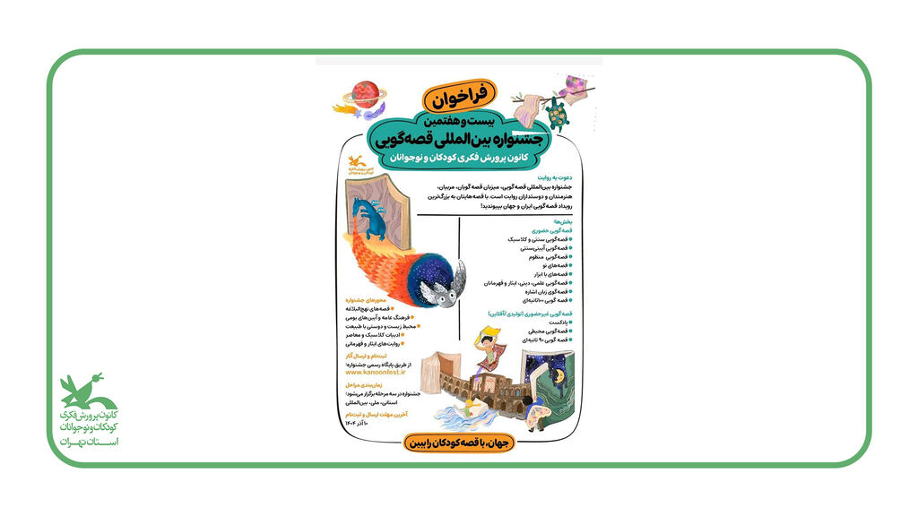 دبیر بیست و هفتمین جشنواره قصه گویی اعلام کرد مهلت ثبت نام در این جشنواره تا تاریخ ۶ آذر ۱۴۰۴ تمدید شده است. علاقمندان می توانند از طریق سایت زیر جهت شرکت در جشنواره اقدام نمایند.
