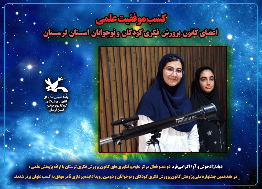 در این مراسم، دیانا زادخوش و آوا اکرامی‌فرد، اعضای نوجوان مرکز علوم و فناوری‌های نوین ایران درکانون پرورش فکری استان لرستان، با ارائه پژوهش علمی تحت عنوان «محاسبه فاصله و تعیین نوع ستاره تپنده دلتا اسکوتی با استفاده از داده‌های ASAS-SN و پارالاکس Gaia» موفق به کسب رتبه برتر در بخش پژوهش اعضا (گروه سنی ۱۴ سال به بالا) شدند.