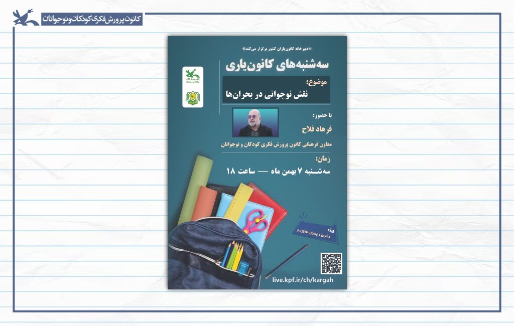 علاقهمندان میتوانند نشست «نقش نوجوانی در بحرانها» را بهصورت زنده از طریق پیوند اینترنتی Live.kpf.ir/ch/kargah دنبال کنند.