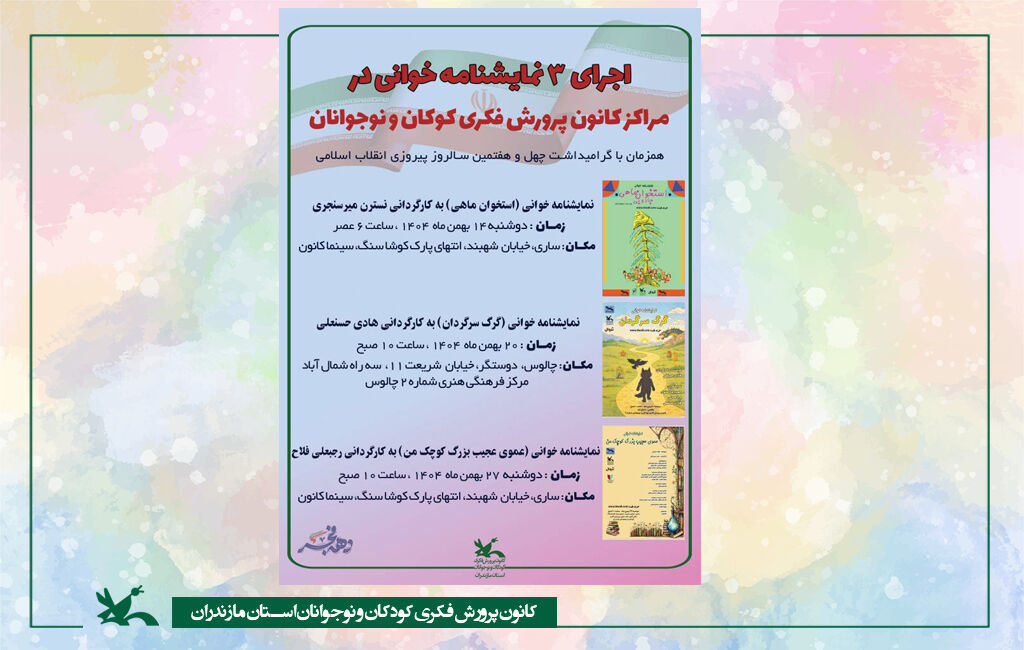 به گزارش روابط عمومی ادارهکل کانون پرورش فکری کودکان و نوجوانان استان مازندران، در ایام دهه فجر انقلاب اسلامی، سه نمایشنامهخوانی با حضور هنرمندان حوزه تئاتر کودک و نوجوان در شهرهای ساری و چالوس اجرا خواهد شد.
