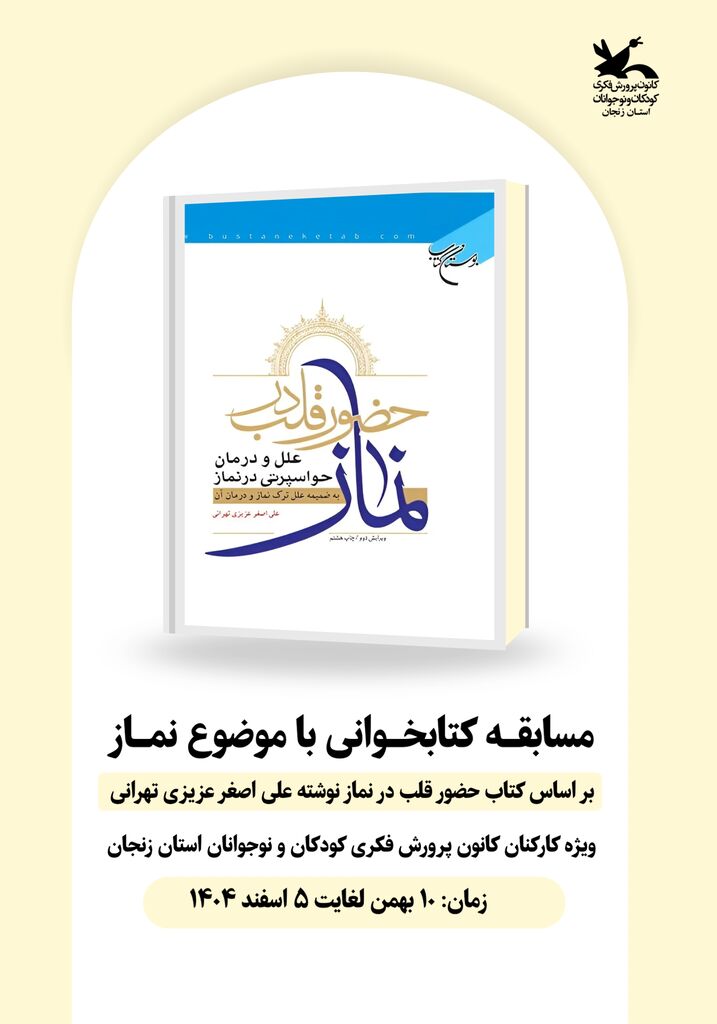 مسابقه کتاب‌خوانی با موضوع نماز و بر اساس کتاب «حضور قلب در نماز» نوشته علی‌اصغر عزیزی تهرانی، ویژه کارکنان کانون پرورش فکری کودکان و نوجوانان استان زنجان، از ۱۰ بهمن تا ۵ اسفند ۱۴۰۴ برگزار می‌شود.