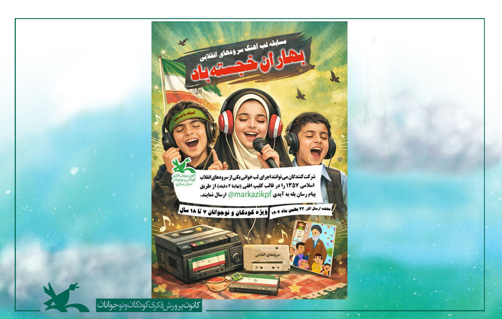 گروه سنی کودکان و نوجوانان ۷ تا ۱۸ سال تا ۲۲ بهمن ماه۱۴۰۴ آثار خود را به آیدی markazikpf@ در پیام رسان بله ارسال کنند .