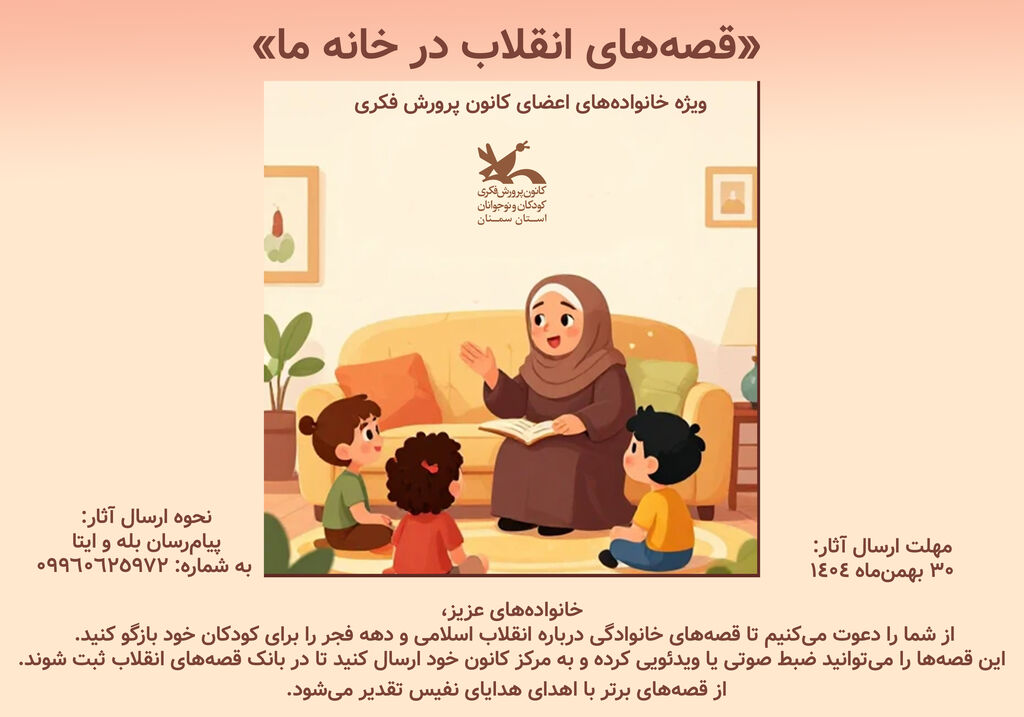 به گزارش روابط عمومی کانون پرورش فکری کودکان و نوجوانان استان سمنان، پویشی با عنوان «قصه‌های انقلاب در خانه ما» با محوریت نقش محوری خانواده در انتقال ارزش‌های انقلابی به نسل جدید، کلید خورد.