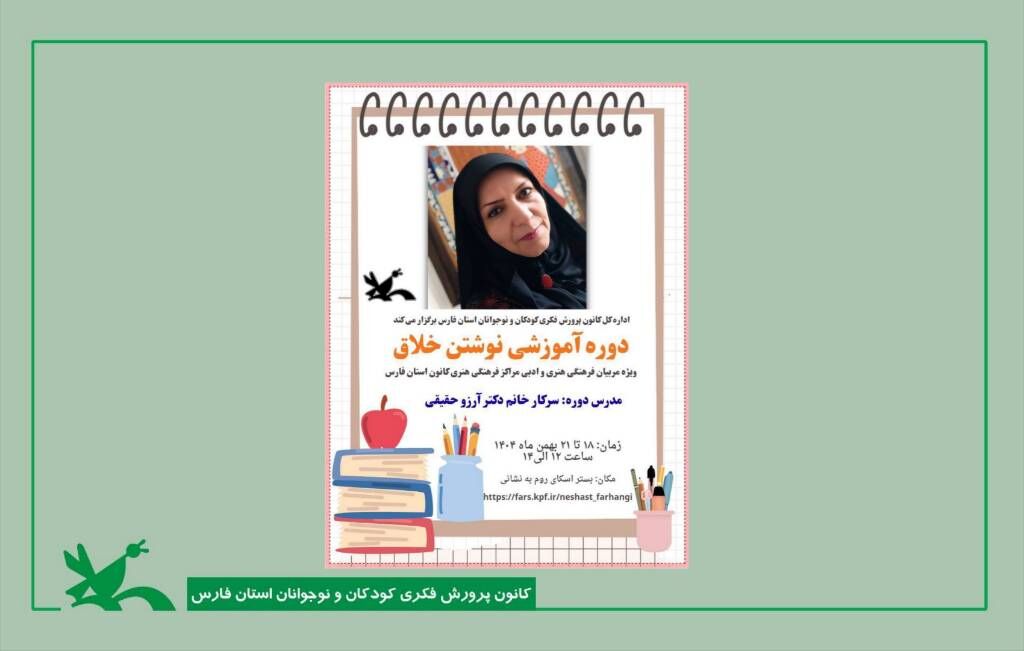 به‌گزارش روابط‌عمومی اداره‌کل کانون پرورش فکری کودکان و نوجوانان استان فارس، کارگاه «نوشتن خلاق مقدماتی» ویژه مربیان کانون پرورش فکری از ۱۸ تا ۲۱ بهمن ۱۴۰۴، همزمان با دهه مبارک فجر انقلاب اسلامی، به مدت ده ساعت به صورت آنلاین با حضور آرزو حقیقی نویسنده و پژوهشگر و مربی‌مسئول کانون پرورش فکری کودکان و نوجوانان مرکز نی‌ریز و حضور فعال مربیان و علاقه‌مندان حوزه ادبیات همراه بود.