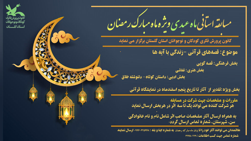 به‌گزارش روابط عمومی اداره‌کل کانون پرورش فکری کودکان و نوجوانان گلستان، همزمان با حلول ماه مبارک رمضان، کانون با انتشار فراخوان مسابقه استانی فرهنگی، ادبی و هنری «ماه عیدی»، زمینه‌ای برای شکوفایی استعدادهای نوجوانان فراهم کرده است.