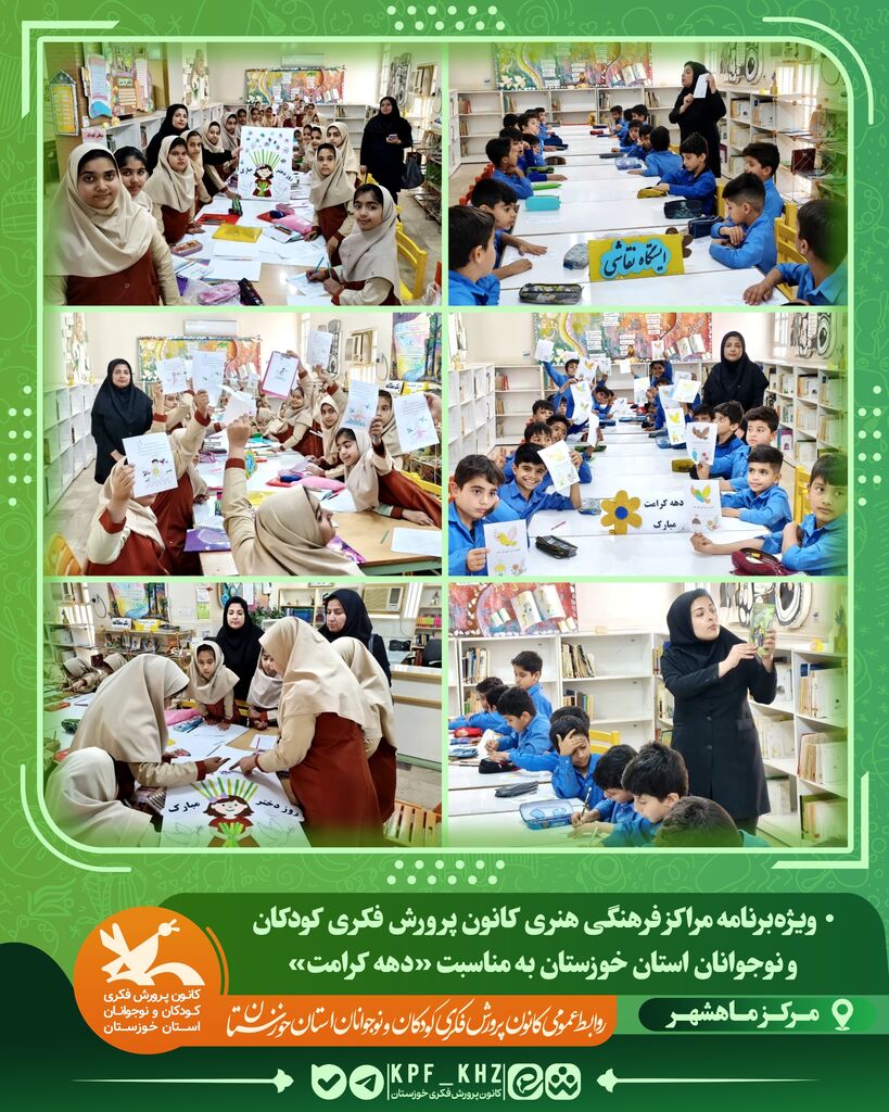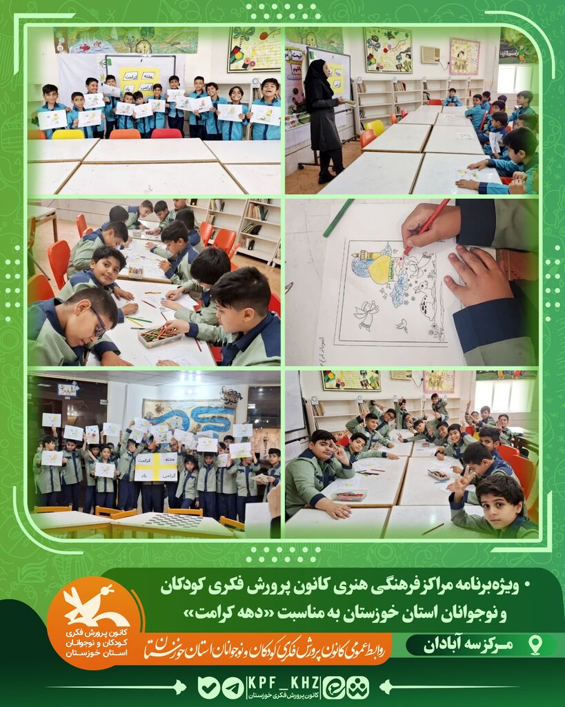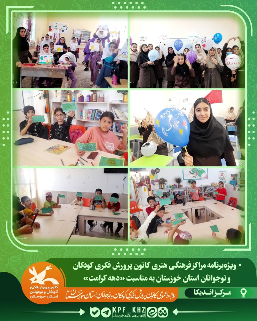 به گزارش روابطعمومی ادارهکل کانون پرورش فکری خوزستان، به مناسبت فرارسیدن دهه کرامت، همزمان با میلاد حضرت معصومه(س)، روز دختر و میلاد امام رضا(ع)، مراکز فرهنگی هنری کانون پرورش فکری کودکان و نوجوانان استان خوزستان با برگزاری ویژهبرنامههای متنوع، جشنهای شاد و معنوی، این مناسبتها را گرامی داشتند.