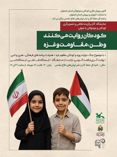 کانون پرورش فکری کودکان و نوجوانان استان اصفهان با مشارکت ادارات کل حفظ آثار و نشر ارزشهای دفاع مقدس و آموزش و پرورش استان به مناسبت هفته ملی کودک نمایشگاه آثار برگزیده نقاشی و تصویرگری کودکان و نوجوانان را با عنوان کودکان روایت می‌کنند" وطن، مقاومت و غزه" را برگزار می‌نماید. این نمایشگاه با موضوع جنگ تحمیلی ۱۲ روزه رژیم کودک‌کش صهیونیستی و آمریکای جنایت‌کار بر علیه جمهوری اسلامی ایران و کشتار کودکان مظلوم غزه همراه با برنامه‌های فرهنگی، هنری و ادبی، روایت‌گری، قصه‌گویی، بازدید از نمایشگاه، ایستگاه نقاشی و ایستگاه ادبی است. لازم به ذکر است بخش قصه گویی این برنامه با عنوان راویان حماسه و با حضور مربیان توانمند کانون پرورش فکری کودکان و نوجوانان که در زمینه قصه گویی دفاع مقدس فعالیت دارند ، اجرا می گردد. زمان: ۱۲ لغایت ۱۶ مهرماه ۱۴۰۴ از ساعت ۹ تا ۱۲. مکان: اداره‌کل حفظ آثار و نشر ارزشهای دفاع مقدس استان اصفهان.