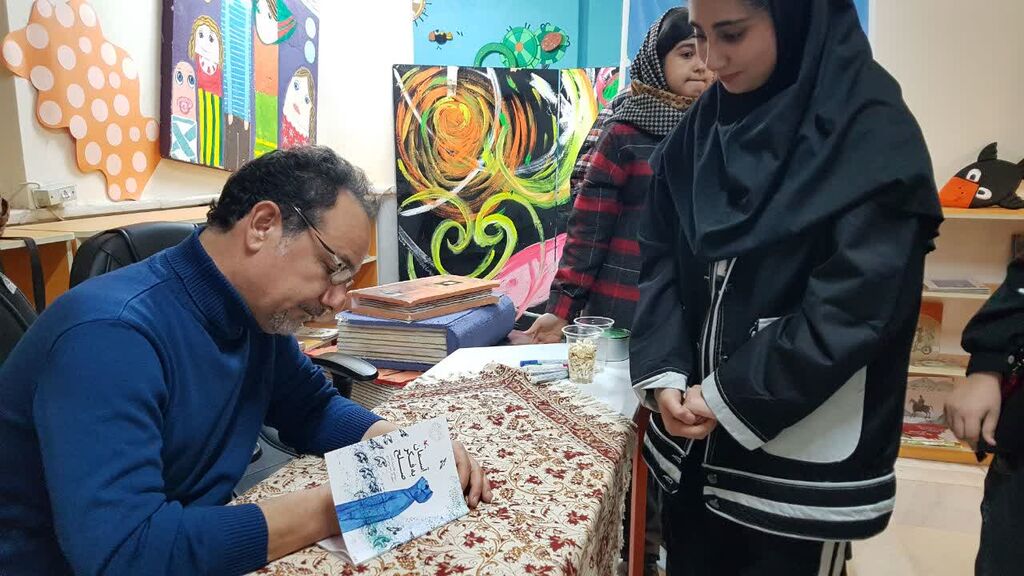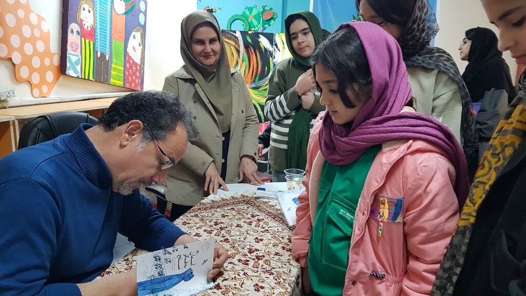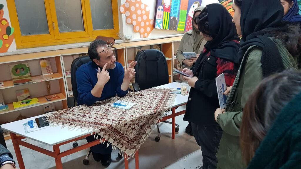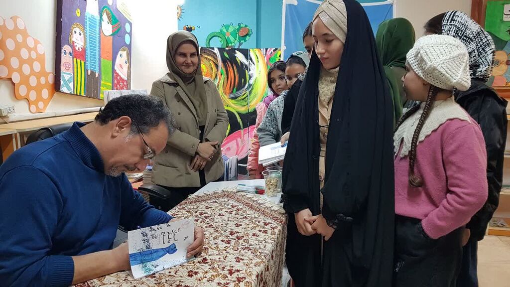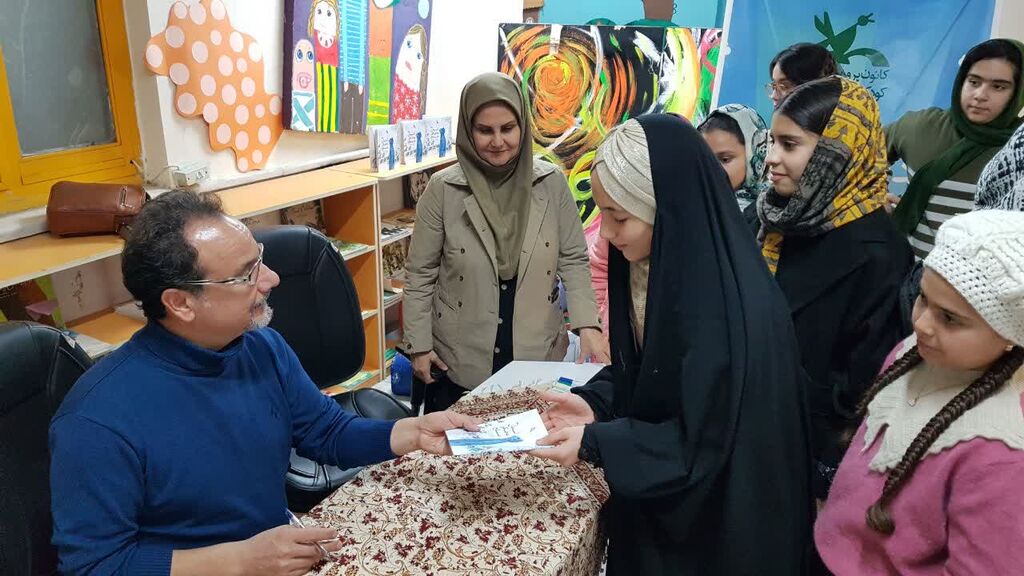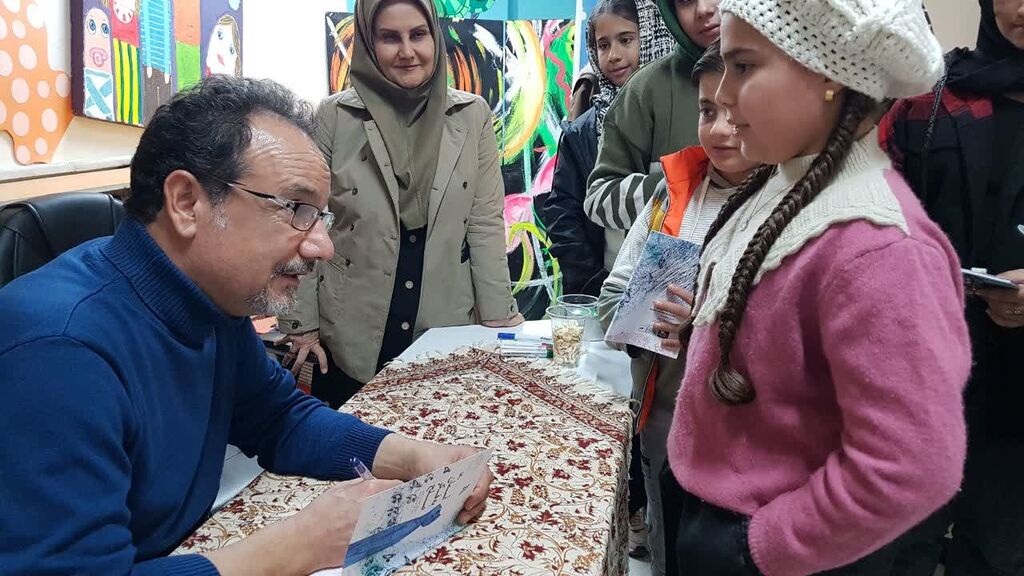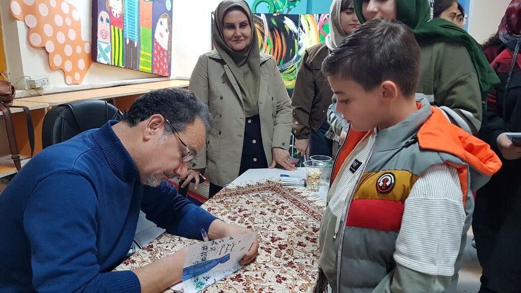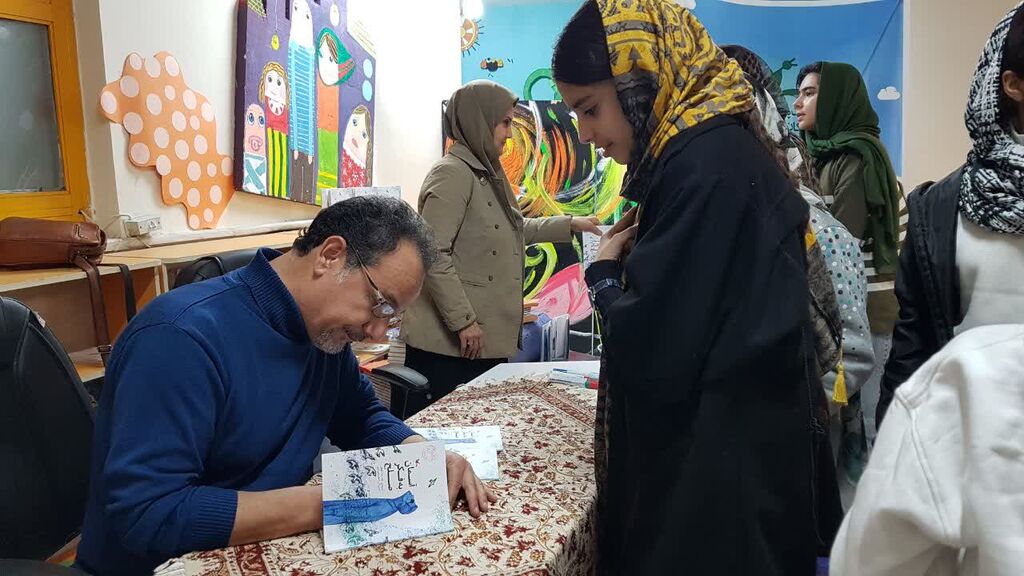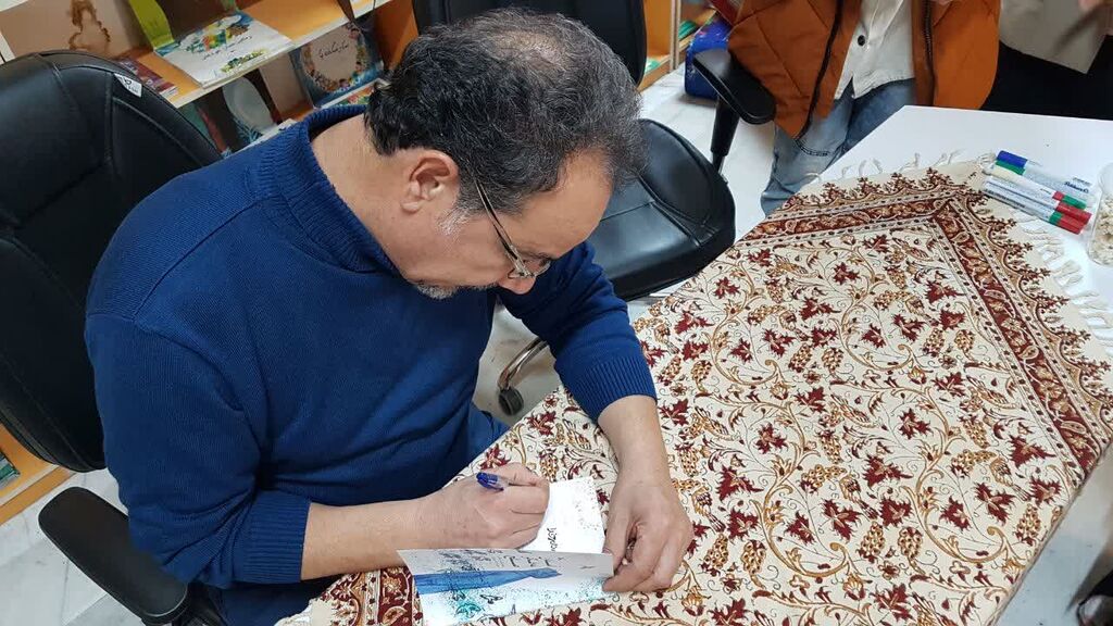 اهدای کتاب "آسمان به فکر صلح" با امضای شاعر، به اعضای حاضر در برنامه دو پنجره