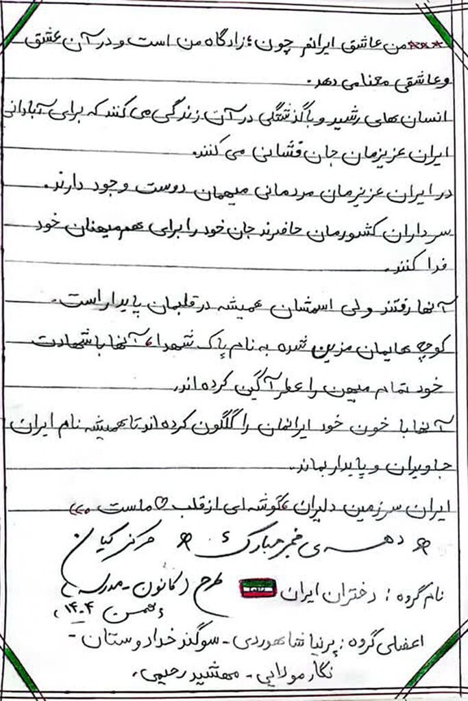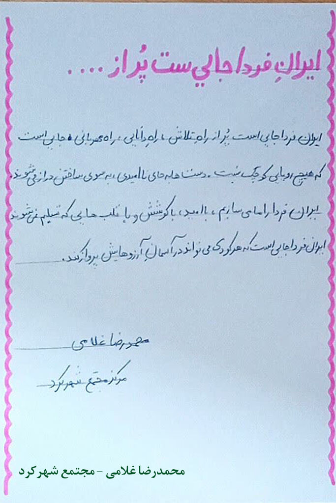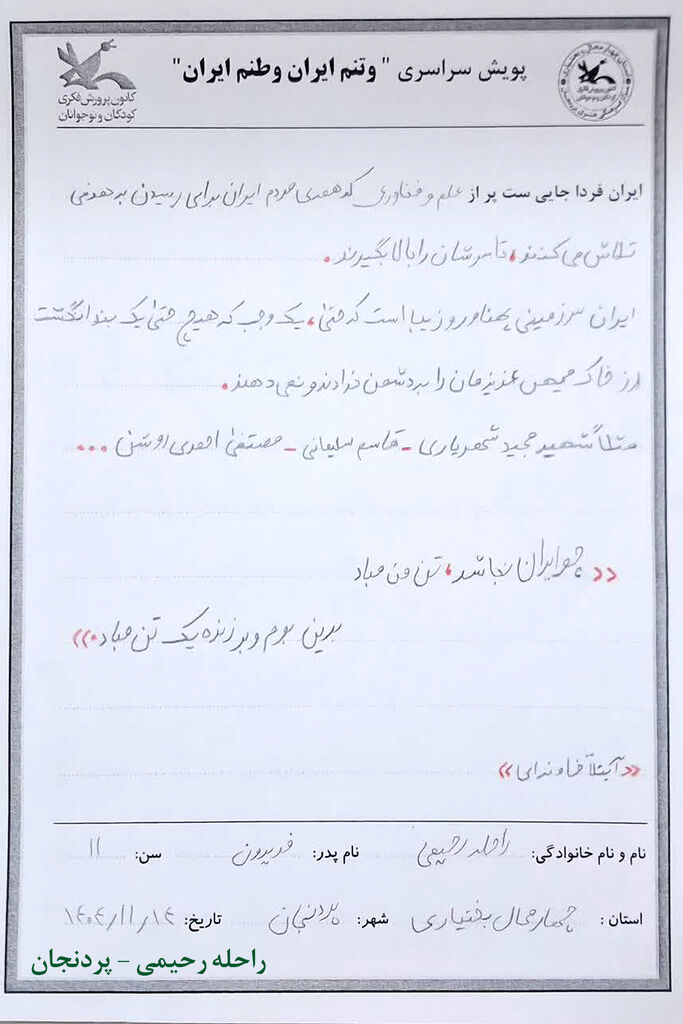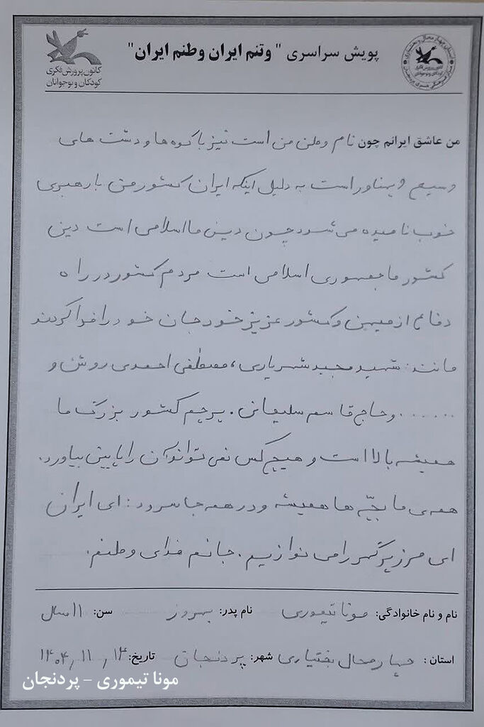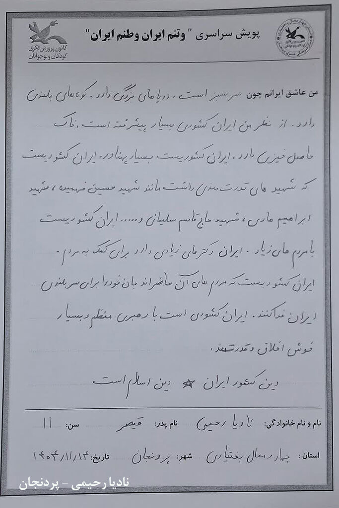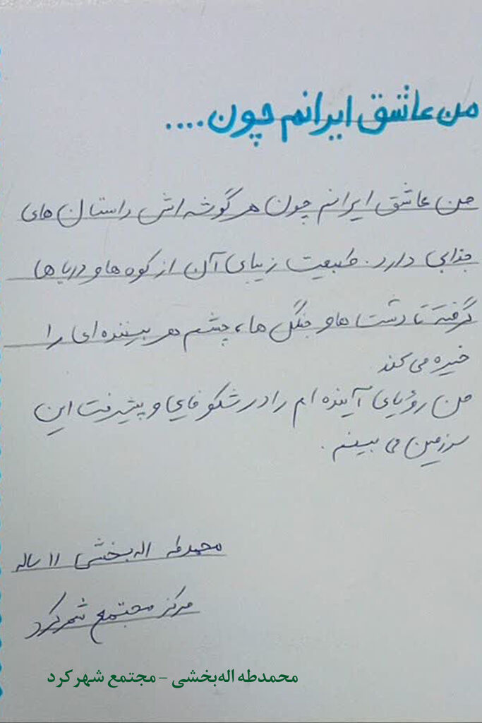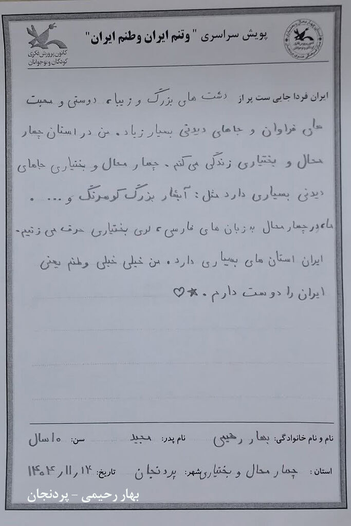 پویش ادبی «تنم ایران، وطنم ایران» به دل‌نوشته‌هایی می‌پردازد که کودکان و نوجوانان عضو کانون‌های پرورش فکری کودکان و نوجوانان سراسر استان چهارمحال و بختیاری در مورد ایران و وطن و آب و خاک خود نوشته‌اند.